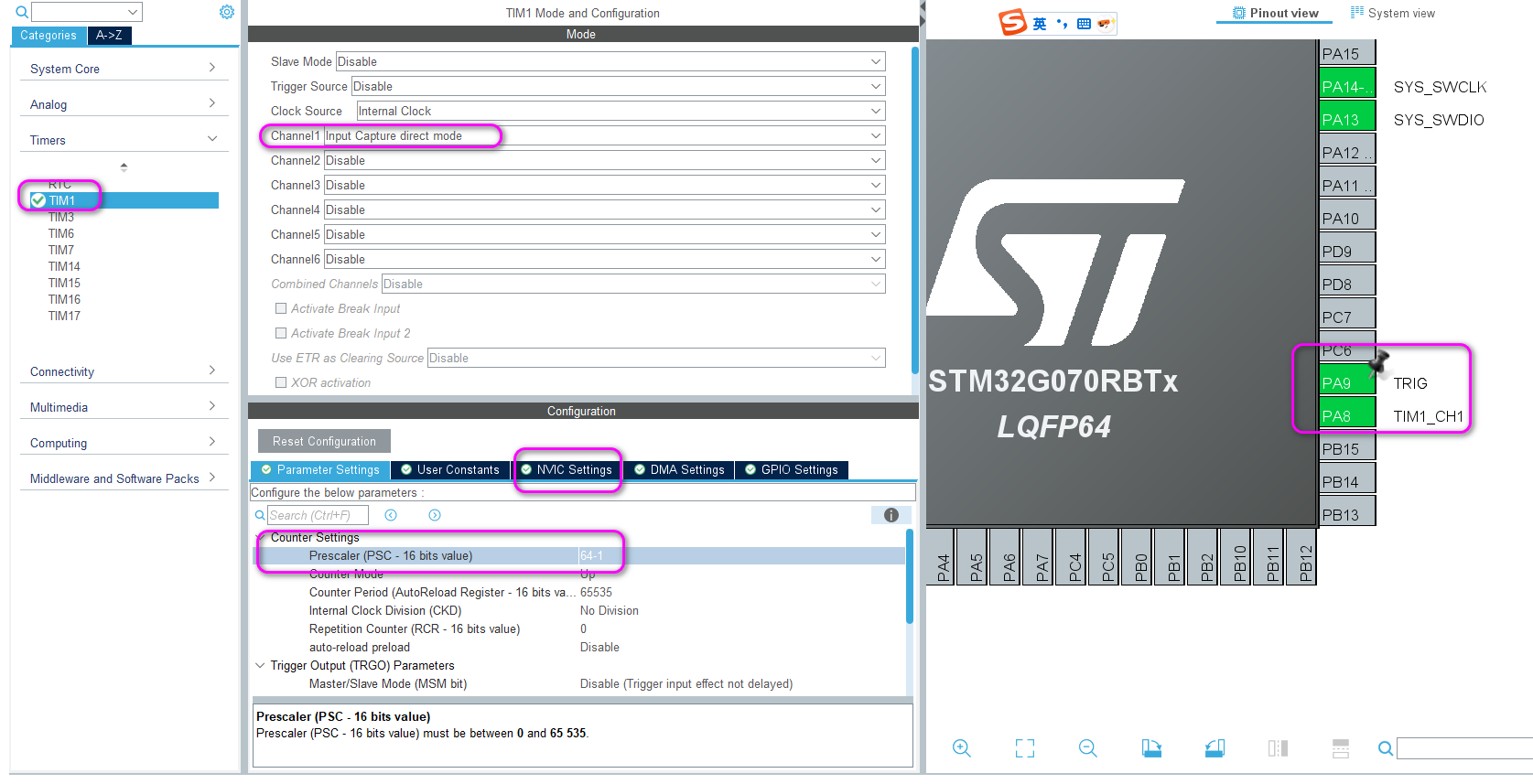 使用STM32CubeMx打开ioc配置文件,然后配置对应的trig引脚为输出,echo引脚为输入捕获并设置定时器参数: